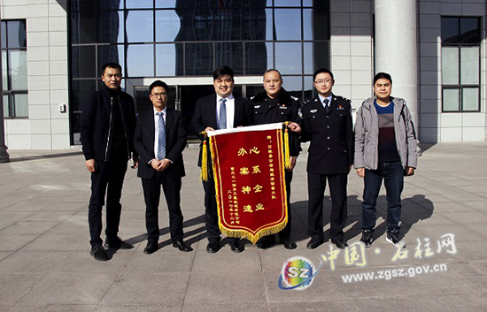 ??? 本网讯(记者 隆太良 文/图)日前,重庆国杰工程机械有限公司负责人专程从重庆主城区来到石柱县城,将一面印有“心系企业 办案神速”的鲜红锦旗送到县公安局经侦大队民警手中,感谢公安民警快速侦破挖掘机被骗一案,为公司挽回经济损失。