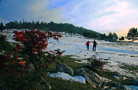 春节期间,除白天池滑雪外,周边也有不少值得一去的赏雪景色。千野草场看雪中火棘也是一大乐趣,大风堡林海雪原格外壮美,更有雪松婆娑。