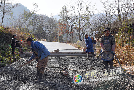 ??? 12月26日,中益乡光明村奋进组,公路硬化正有序推进。为尽快破解中益乡深度贫困难题,县交通部门创新整合建设项目,联合当地党委政府、相关部门,全面推进进村入组公路硬化工程,携手浇筑致富路。记者 谭华祥