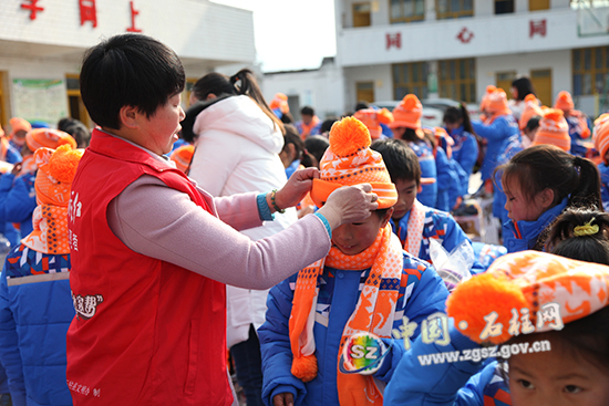 志愿者为学生戴帽子