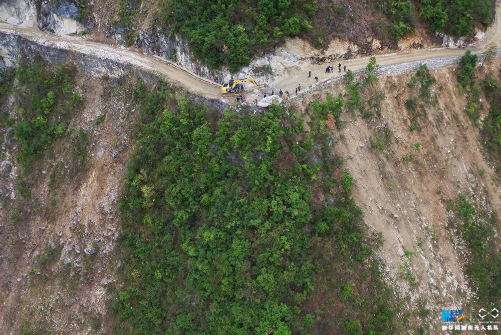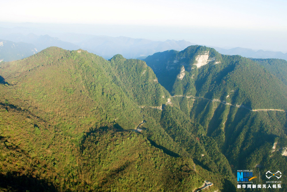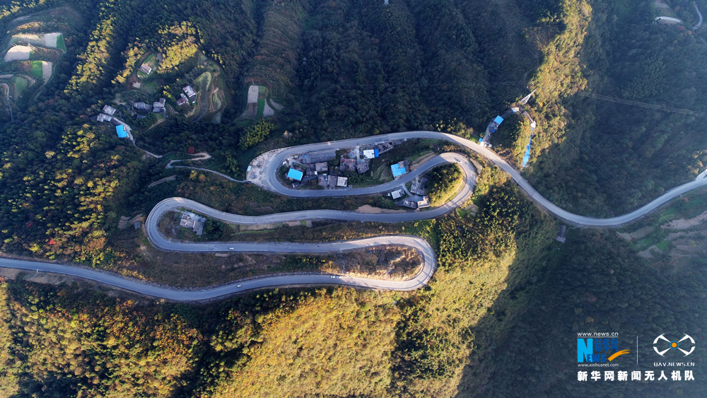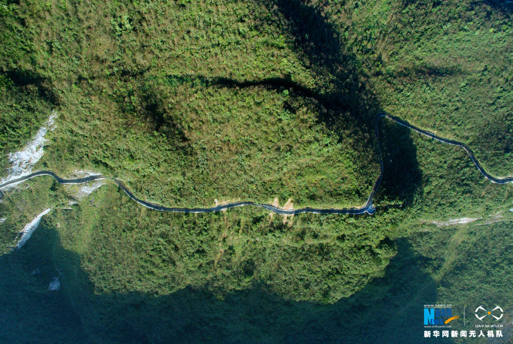 ????图为2016年12月,无人机从空中俯视天山坪旅游公路,依山而建的公路在山间蜿蜒盘旋,以往的羊肠小道变为柏油路面,方便群众出行。新华网 赵紫东摄 飞手:郑杰