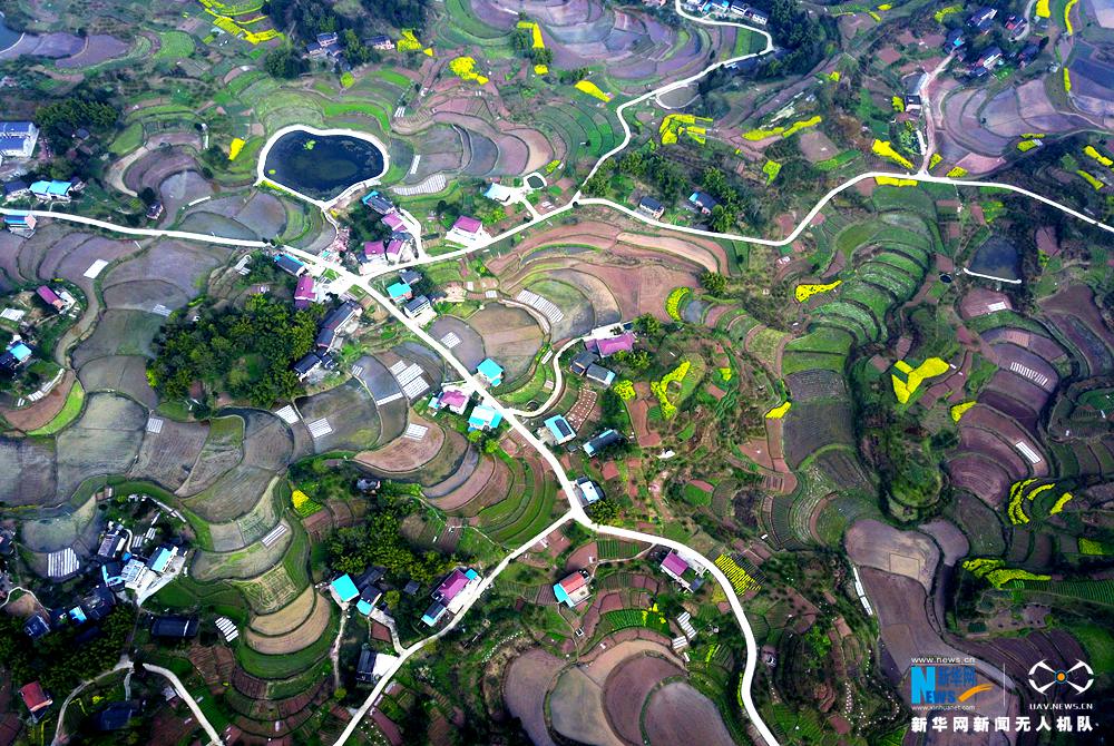 ????要致富,先修路。重庆市忠县花桥镇天井村便是修路致富的典型例子,从几年前的泥泞路,到如今四通八达的水泥公路,天井村已经从贫困落后的老旧村落,转身为具有田园风光的美丽乡村。图为2017年3月,航拍重庆忠县天井村全貌,白色的水泥公路四通八达。新华网发(伍北海 摄)