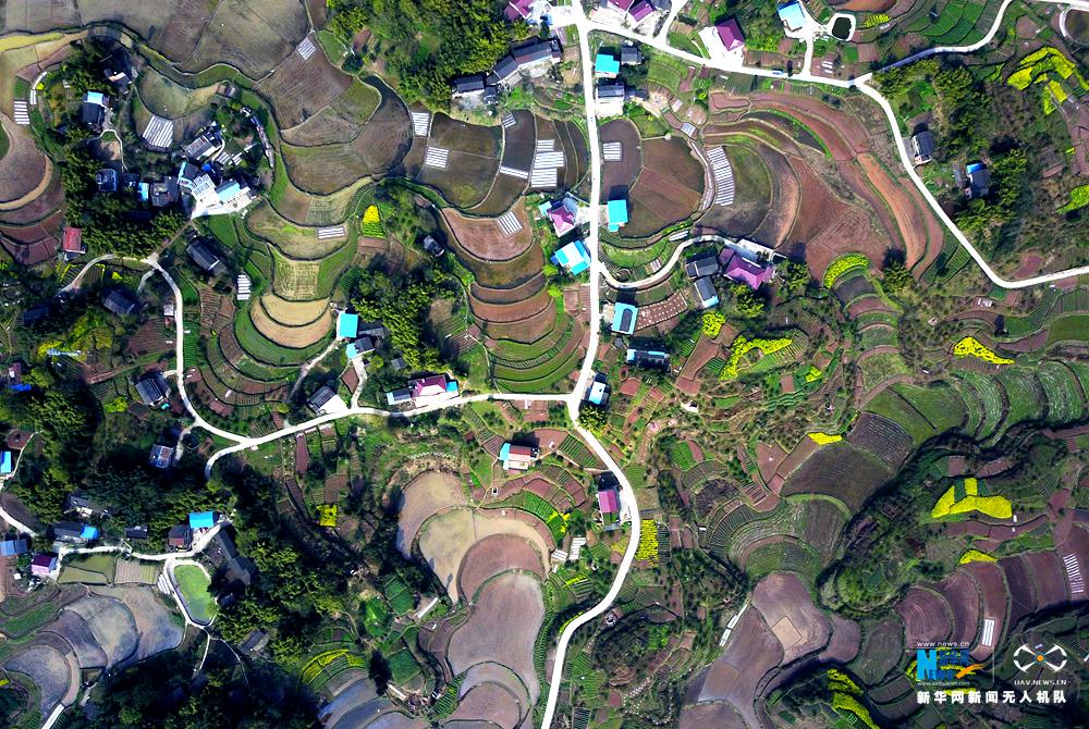 图为2017年3月,航拍重庆市酉阳土家族苗族自治县涂市乡麻田村乡村公路。新华网发(陈碧生 摄)