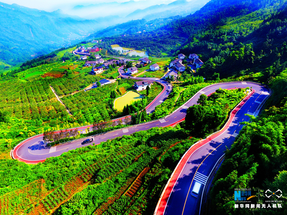 ????重庆以“山城”著称,多数区县以山地面貌为主。因此,重庆许多乡村公路都穿梭于大山之间,险象环生。在重庆市秀山县洪安镇,便有这样一条公路,因悬挂在陡峭山壁上而出名。这条公路是从重庆秀山洪安平马茶海通往川河盖景区的一条乡村公路,全长5757米,海拨从625米升至1175米。公路坡陡弯急拐多,共计45道拐,堪称公路奇观。图为2017年9月,无人机视角下的“45道拐”。新华网 李相博 摄 飞手:郑杰