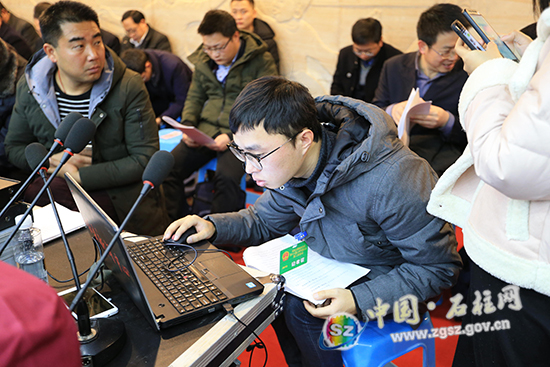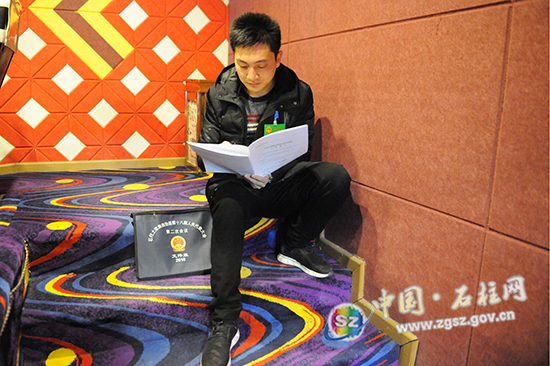 会场没有空座,县新闻中心记者温劲豪坐在楼梯口认真听取核对政府工作报告。