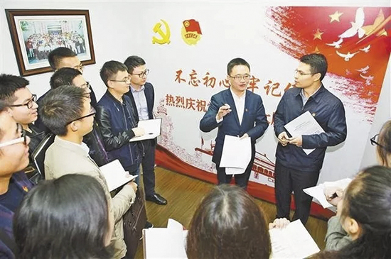 10月26日,团市委,十九大代表杨大可(右二)与胡栋(右一)正在分享出席党的十九大的心得体会。记者谢智强摄