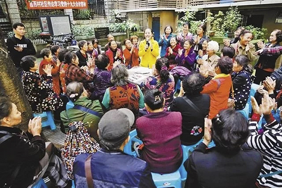 10月26日,渝中区上清寺街道嘉西村社区院坝,十九大代表吴中兰宣传党的十九大精神,与居民分享参会见闻,赢得阵阵掌声。记者 崔力 摄