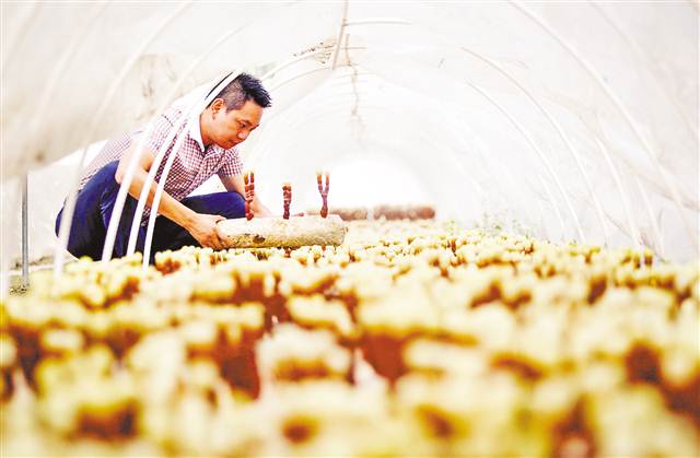 城口县松坤菌草公司食药用菌大棚内,公司负责人何立坤查看鹿角灵芝生长情况。(本组图片为本报资料图片,均由记者苏思摄)